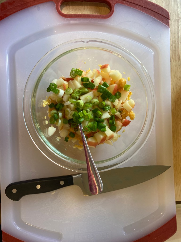 - Cut up the 1/2 apple into small pieces